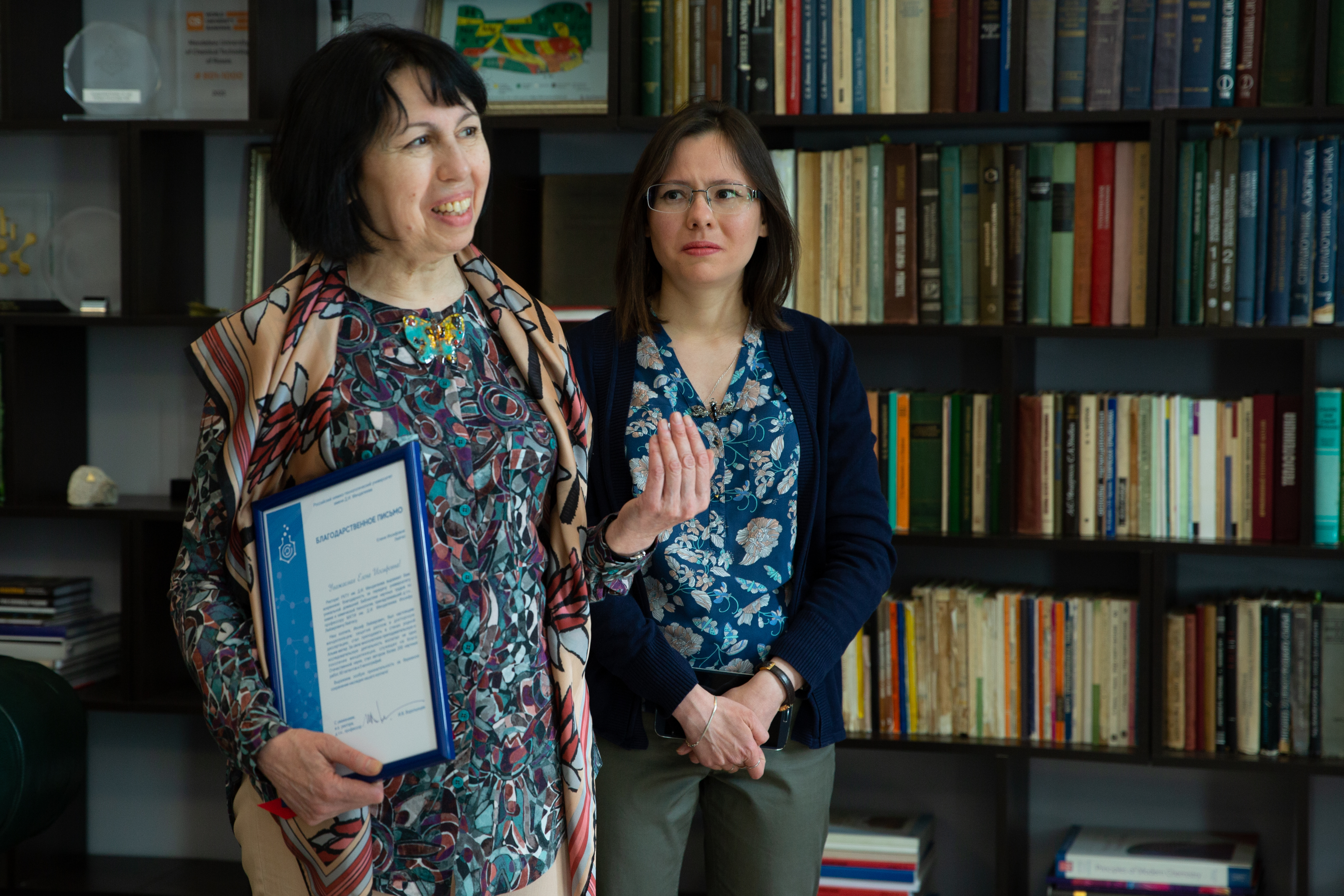 Глава вуза вручил дочери Елене и внучке профессора Ольге благодарственное письмо, а затем состоялось торжественное открытие памятной таблички с надписью «Библиотека передана в дар университету семьей выпускника и профессора МХТИ Иосифа Лейзеровича Лейтеса».